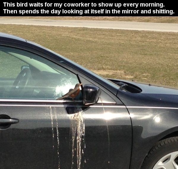This bird waits for my coworker to show up every morning, then spends the day looking in the mirror and pooping...